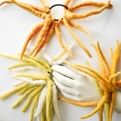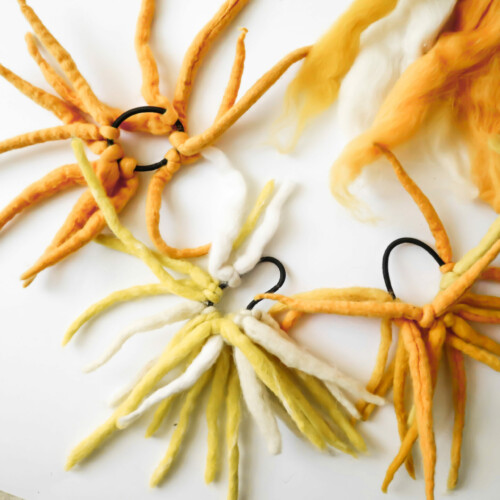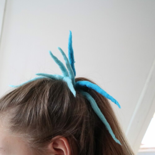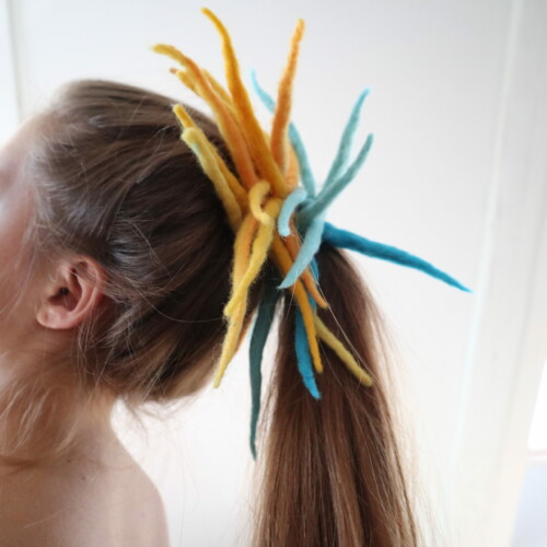 Plstění mokrého rouna v mýdlové vodě je stará technika, která je velmi zábavná a zvládnou ji i malé děti. Základní jednoduchý výrobek jsou barevné dredy, které se dají navléknout na gumičku jako ozdoba do vlasů nebo si je můžete nechat jako přívěšek na klíče.