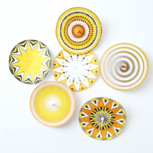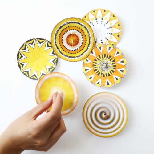Papírová káča je magická hračka. Jedním pohybem ji roztočíte, smícháte všechny barvy a ornament zmizí ve víru pohybu. Máme pro vás připraveny různé vzory a ornamenty na malých terčících, které si můžete vybarvit. Můžete samozřejmě vytvářet i vlastní varianty. Pro delší trvanlivost můžeme vybarvené káči i zalaminovat. Papírová hračka je skvělá i při výuce míchání barev a dalších odstínů. Modro-červený ornament se při roztočení slije a vznikne… Ano, fialová!!!
